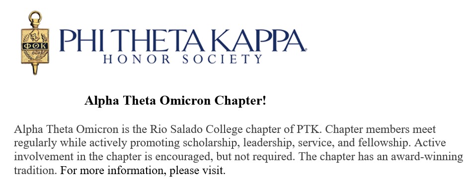Thank you for considering a donation to the Alpha Theta Omicron PTK Chapter at Rio Salado College. Any amount you donate is welcome and appreciated. Questions? Contact us at ptk@riosalado.edu Thank you!